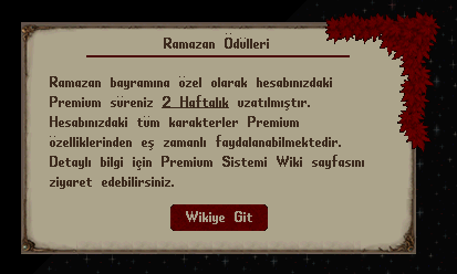 • Ramazan bayramını kutlamak amacı ile tüm oyunculara 2 haftalık Premium tanımlanmıştır. Oyuna giriş yaptığınızda 14 günlük Premiumunuz aktif olacaktır. Eğer Premium üyesi iseniz Premium süreniz 14 gün uzatılacaktır.