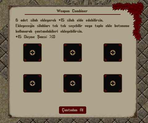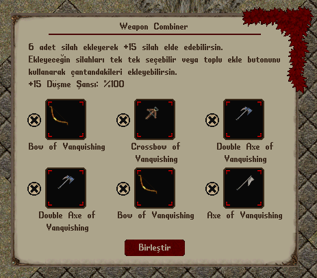 6 adet silah eklendikten sonra “Birleştir” butonuna tıklayarak, eklenen silahlara göre belirlenen toplam şans üzerinden oyuncuya rastgele bir +15 silah elde edebilirsiniz.