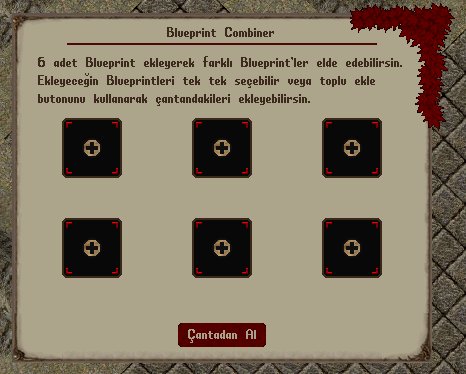 Blueprint eklemek için "+" butonuna tıklayarak Blueprintleri tek tek ekleyebilir veya "Çantadan Al" butonuna basarak çantanızda bulunan tüm Blueprintleri otomatik olarak ekleyebilirsiniz.
