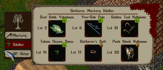 Ödüller sekmesinde, Gatherer Mastery seviyelerine göre alabileceğiniz ödülleri görebilirsiniz. Her ödülün yanında bir kilit simgesi veya tik işareti bulunur. Ödüller alınmadıysa ödül kutusu üzerinde kilit, alındıysa tik işareti gösterilir.