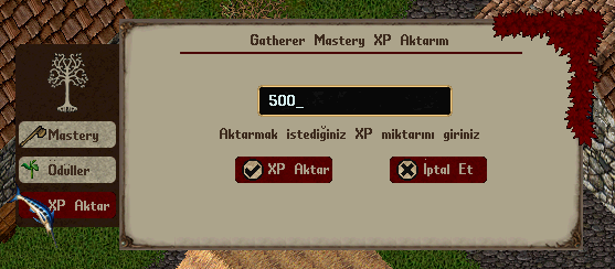 Bu sekmede, mevcut XP’lerini başka bir oyuncuya aktarabilirsiniz. Aktarılmak istenen XP miktarı yazılır ve XP Aktar butonuna basıldığında, bir XP Deed çantaya düşer.