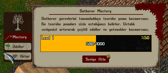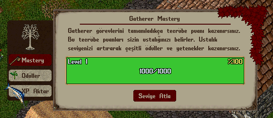 Mastery sekmesinde, mevcut Gatherer Mastery seviyenizi ve bir sonraki seviyeye geçmek için gereken XP miktarını görebilirsiniz. Eğer yeterli XP’ye sahipseniz, Seviye Atla butonu aktif olacaktır. Bu butona tıklayarak bir üst seviyeye geçebilirsiniz.