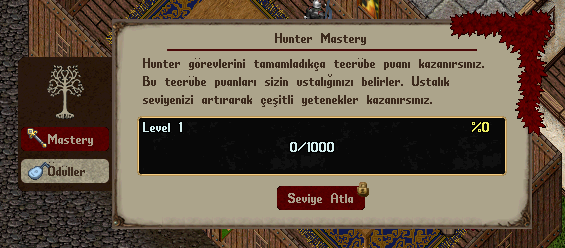 Mastery sekmesinde, mevcut Hunter Mastery seviyenizi ve bir sonraki seviyeye geçmek için gereken XP miktarını görebilirsiniz. Eğer yeterli XP’ye sahipseniz, Seviye Atla butonu aktif olacaktır. Bu butona tıklayarak bir üst seviyeye geçebilirsiniz.