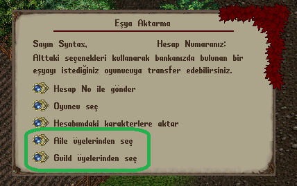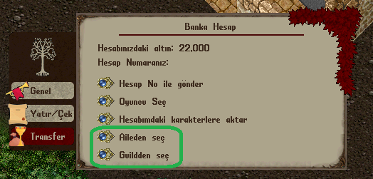 Normal transfer işleyişine ek olarak Aile üyeleri ve Guild üyeleri transfer ekranında otomatik olarak listelenir ve kolayca seçilebilir.