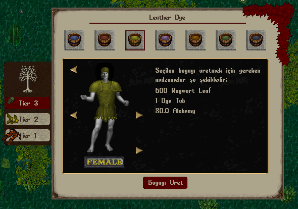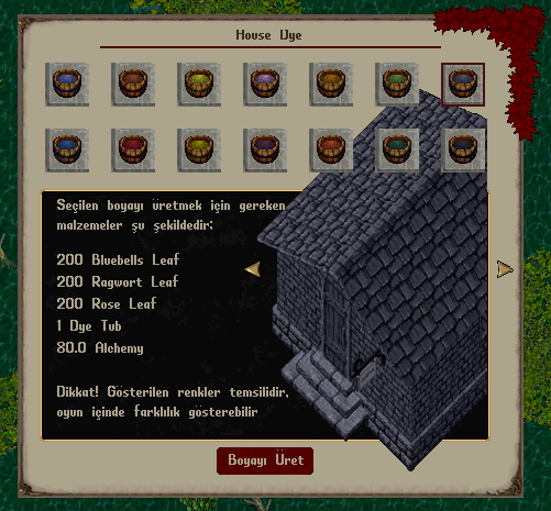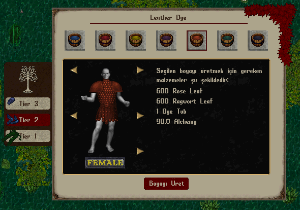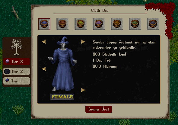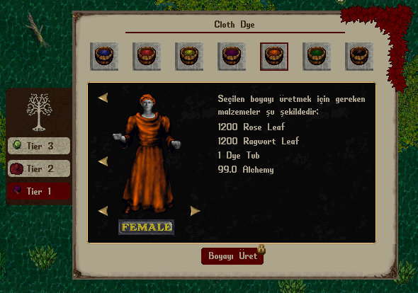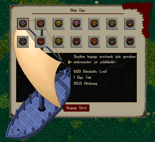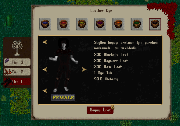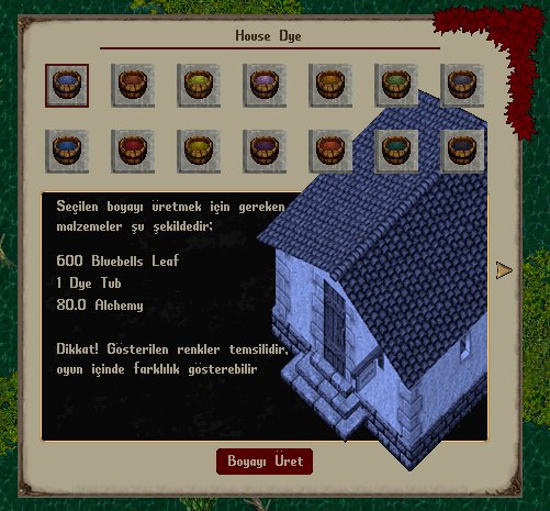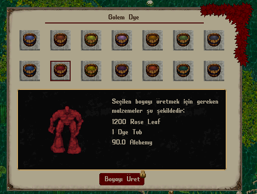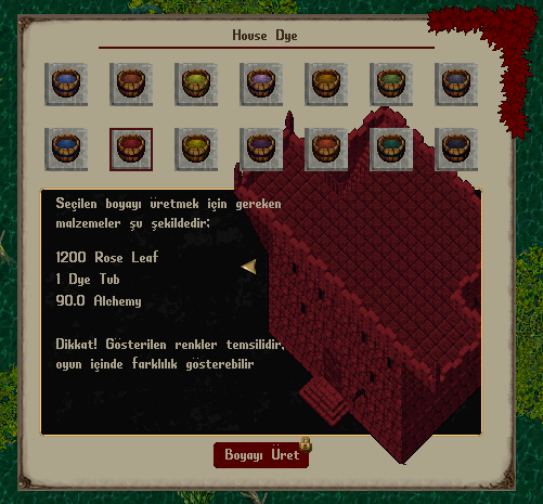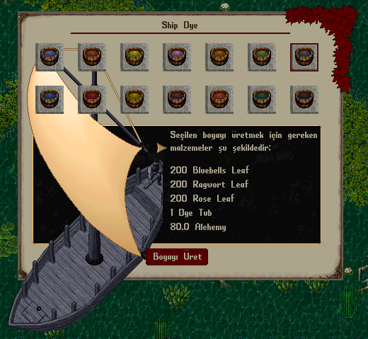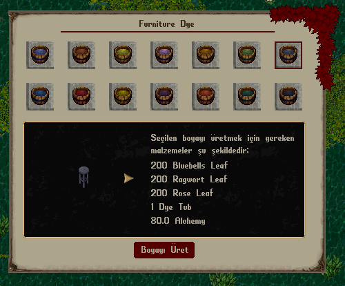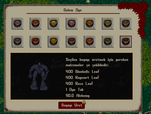 Üretimi için toplam 600 yaprak, Dye Tub ve 80.0 Alchemy yeteneği gerektirir.