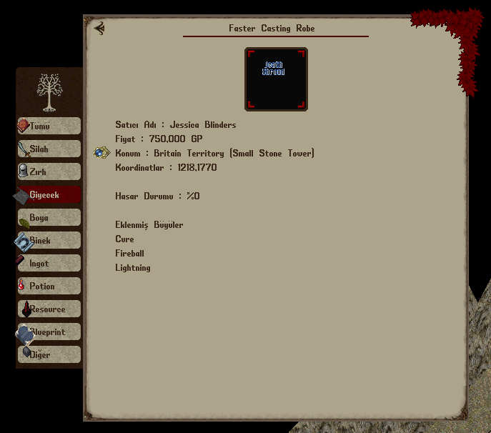 Eğer eşya bir Faster Casting Robe ise ve üzerine büyü işlenmişse, bu büyüye ait detaylar ekranda yer alır.