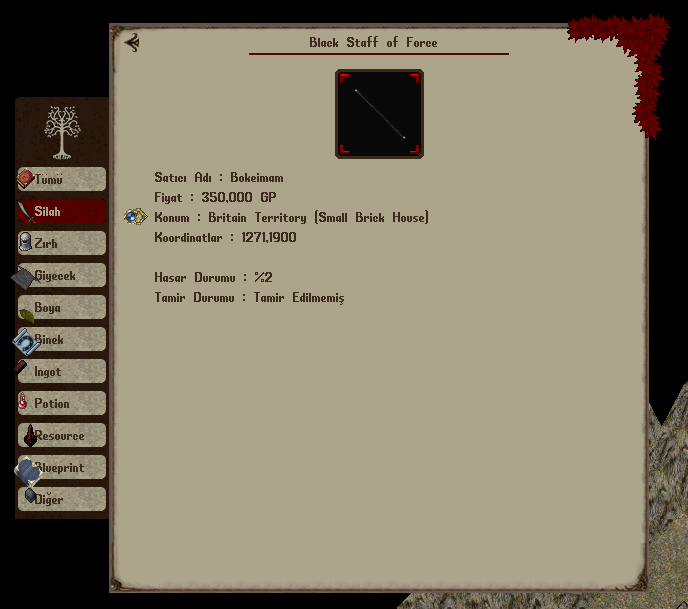 Eğer eşya bir silah ise, hasar durumu ve tamir durumu bilgilerini inceleyebilirsiniz.